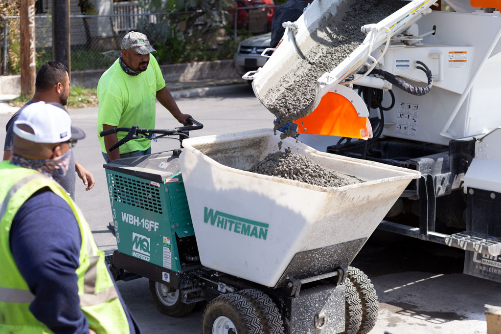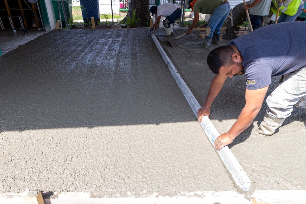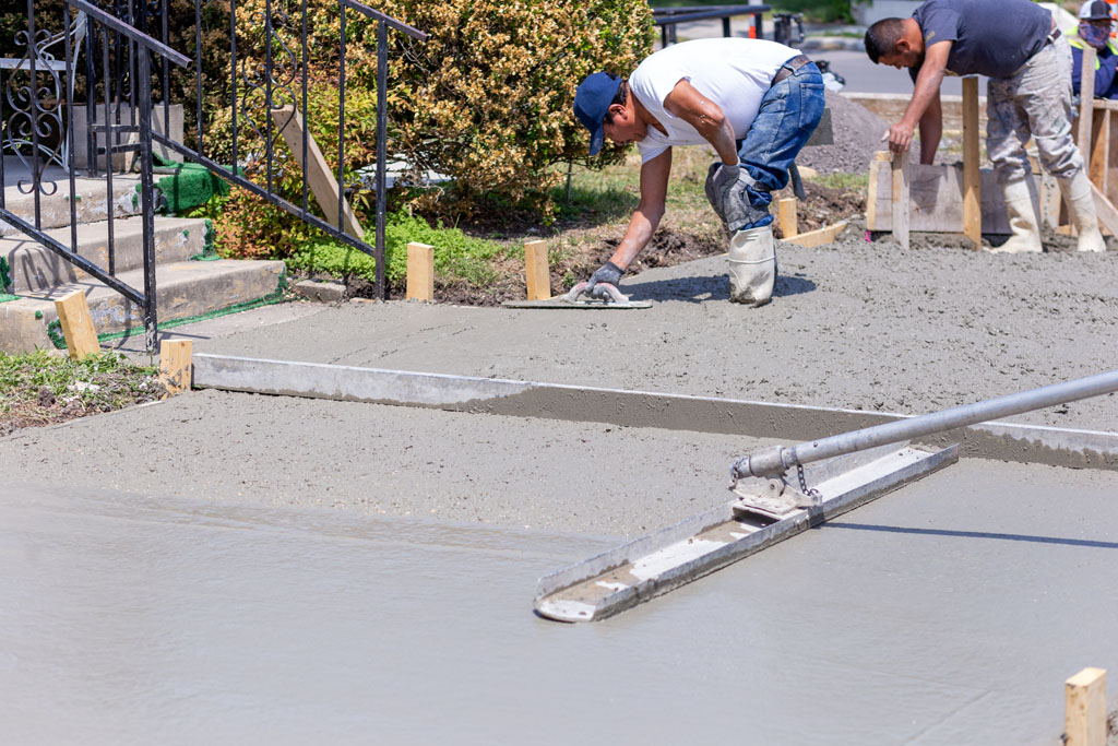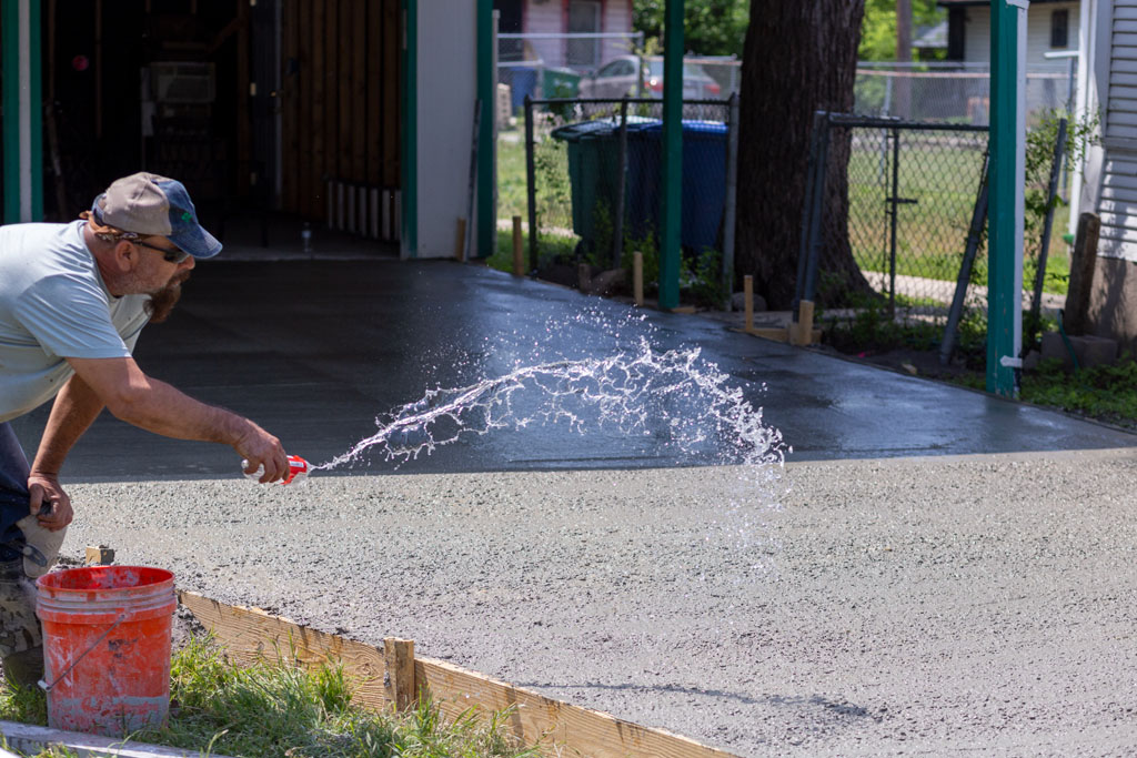 With the aggregate base layed, the wooden forms set, and the rebar tied in place, we are ready to pour and finish the concrete driveway on this hot sunny day. With other concrete projects, the concrete truck can back up and pour the concrete ready mix directly into the wooden forms as needed. With this driveway there’s limited space and access, therefore a concrete buggy is used to transport concrete from the truck to the area our crew will start spreading the concrete. We started from the end of the driveway by the client’s garage, and worked our way to the street. We started in the morning, and finished the concrete driveway towards the afternoon.
