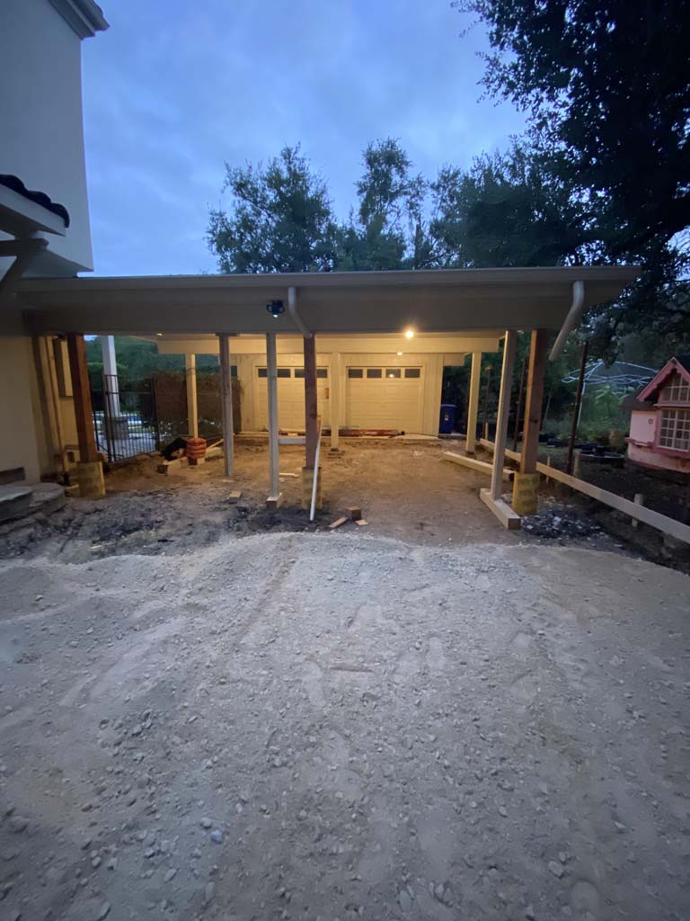 The main issue the client had with their existing asphalt driveway was minimal drainage of water during inclement weather, resulting in the flooding or pooling of water underneath the carport. Poor drainage over time will weaken the base material and subgrade below the pavement, resulting in damage over time under the weight of traffic. While asphalt has the capacity to last a long time and can be repaired, the client was tired of running into this same drainage issue over time and wanted a better solution that will last.